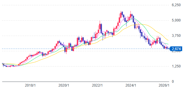 2024年のピーク時は5,765円でしたが、2026年4月時点の株価は約2,670円前後と年初来安値を更新しています。