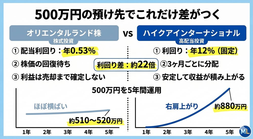 ※同じ500万円でも、「オリエンタルランド株」と「高利回り投資」の、預け先の違いだけで将来の資産額は大きく変わります。